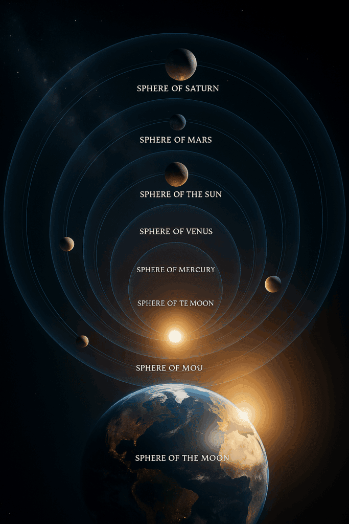 Long ago, people imagined space as a set of invisible spheres or shells around Earth. Each sphere carried a planet or the Moon, all circling our world one outside the other.The Moon’s sphere was closest, moving around Earth.•Next came Mercury, Venus, the Sun, Mars, Jupiter, and Saturn—each in its own shell, farther out.•People thought everything in the sky traveled in perfect circles, set by these spheres.Today, we know this isn’t true. The Sun is at the center, and Earth is just one planet moving around it. Planets don’t sit on shells—they travel in big, looping orbits through empty space.But this old idea helps us see how people tried to make sense of the universe before telescopes or computers existed. It’s like guessing the rules of a game by watching from outside, using your imagination and simple tools. Their picture wasn’t right, but it was clever and showed how human curiosity pushes us to explore and learn.
