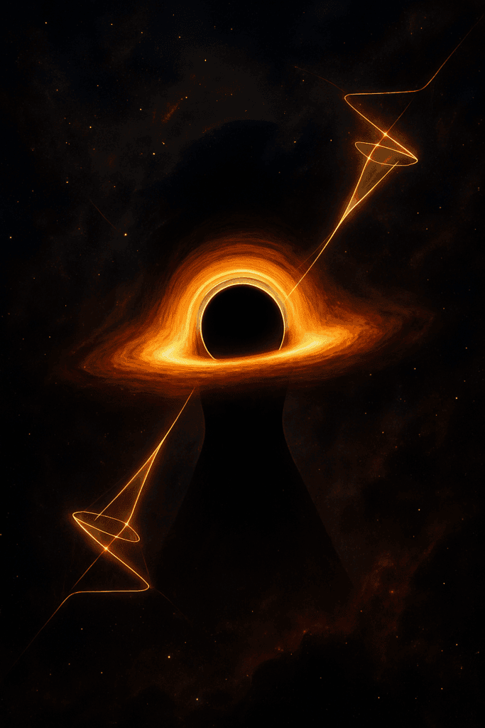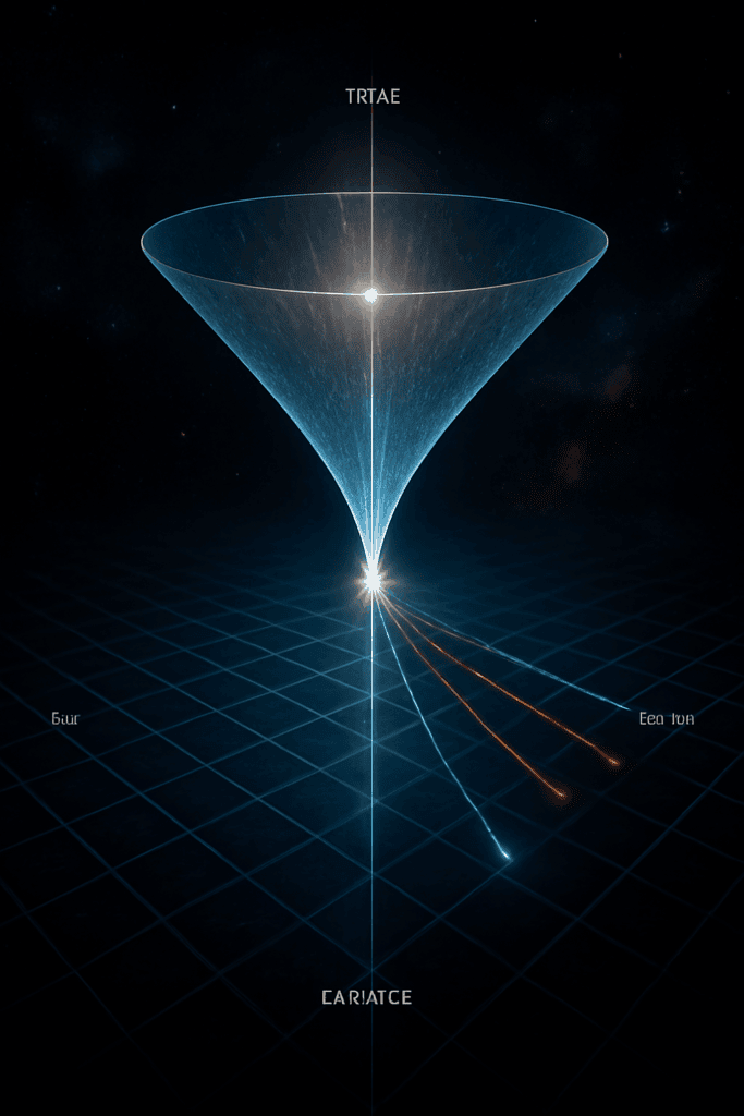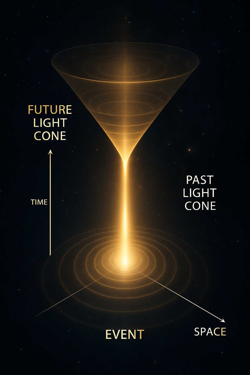 Take a look at this awesome image! It shows something called a light cone. Let’s break it down in easy words, just like before:What’s a Light Cone?Imagine you’re standing in the middle of a huge, dark space. If you turn on a flashlight, the light spreads out really fast. The cone shape on the picture is like the path light takes from a single event—right where you are!The bottom part (“past light cone”) is all the light that reached you up until now, coming from everywhere in space.•The top part (“future light cone”) is where your light can go next. It spreads out further and further, like ripples from a splash in water.•How Does This Relate to Space and Time?Think of the vertical line as time. As time goes on, the light moves farther and the cone gets wider.Time goes up in the picture.•Space goes out sideways.•If you move away from the center, you’re going into the future.Imagine It With TechnologyIf you’ve ever seen WiFi waves spreading from a router, or watched animation of ripples in a pond, it’s similar. Every event in space can send out signals or light, reaching only certain places over time.The cone is like the signal range—only things inside the cone can “meet” or “talk” later on.•Why Is This Cool?It teaches us that not everything in space can reach everything else right away. There’s a limit: the speed of light. It also means our actions can only affect certain places in the future, like sending out signals in a game or from a phone.So, just like spheres and orbits helped ancient people imagine the universe, today scientists use light cones to understand how events connect in space and time. The universe is a lot like a giant tech network—with signals, limits, and possibilities!