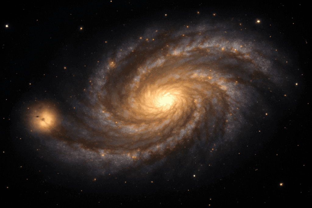 Look at this awesome galaxy picture! A galaxy is a HUGE family of stars, swirling together in space. The one you see has spiral arms that look like twirly noodles, spinning slowly around its center.Our own Sun is just one ordinary star, tucked away near the edge of a spiral arm—not the center!•Galaxies are super big: this one is about 100,000 light-years across. That means even light, which travels super fast, takes 100,000 years to zoom from one side to the other!•We used to think Earth was the center of everything, but now we know it’s just one tiny part of a gigantic galaxy. All the stars you see in the night sky are really far away—so far, they just look like little dots!You can’t see what shape stars are, or how big they are, just by looking. But you can see their color—and scientists use that to learn about different kinds of stars.Space is huge and full of wonders. This galaxy picture shows just how much more there is to discover!