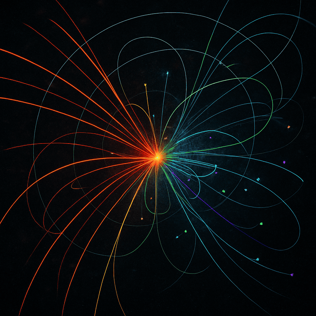 Imagine two tiny, super-fast cars zooming toward each other—one is a proton and the other is an antiproton. When they crash, it’s not just a regular wreck. Instead, they smash apart and release even tinier pieces called quarks and gluons.In normal life, quarks and gluons are always trapped inside bigger particles, held together by the powerful strong nuclear force—think of the way magnets stick together.But in a high-energy collision, like the one in the picture, that force gets weak for a split second.The result? Quarks and gluons shoot out almost “free,” leaving trails that scientists can see as curved lines.It’s like watching the gears and springs fly out of two clocks that crash into each other—suddenly you see all the secret parts inside!This collision helps scientists study what the building blocks of matter look like and how they behave, teaching us more about the amazing world inside every atom.
