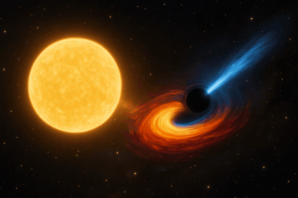 Near the center of the image, you see a bright spot—that’s a star in the Cygnus X-1 system. But it’s not alone! It orbits around something mysterious: a black hole.What’s happening? The star and the black hole circle each other, held together by gravity.You only see the visible star, but the black hole is there, pulling matter from the star like a powerful vacuum.As the star’s matter falls toward the black hole, it spirals in, getting super hot and bursting out X-rays.Scientists spot Cygnus X-1 by its strong X-ray signals. That’s how we know it’s not just a star—it’s a star paired with a black hole, locked in a cosmic dance!
