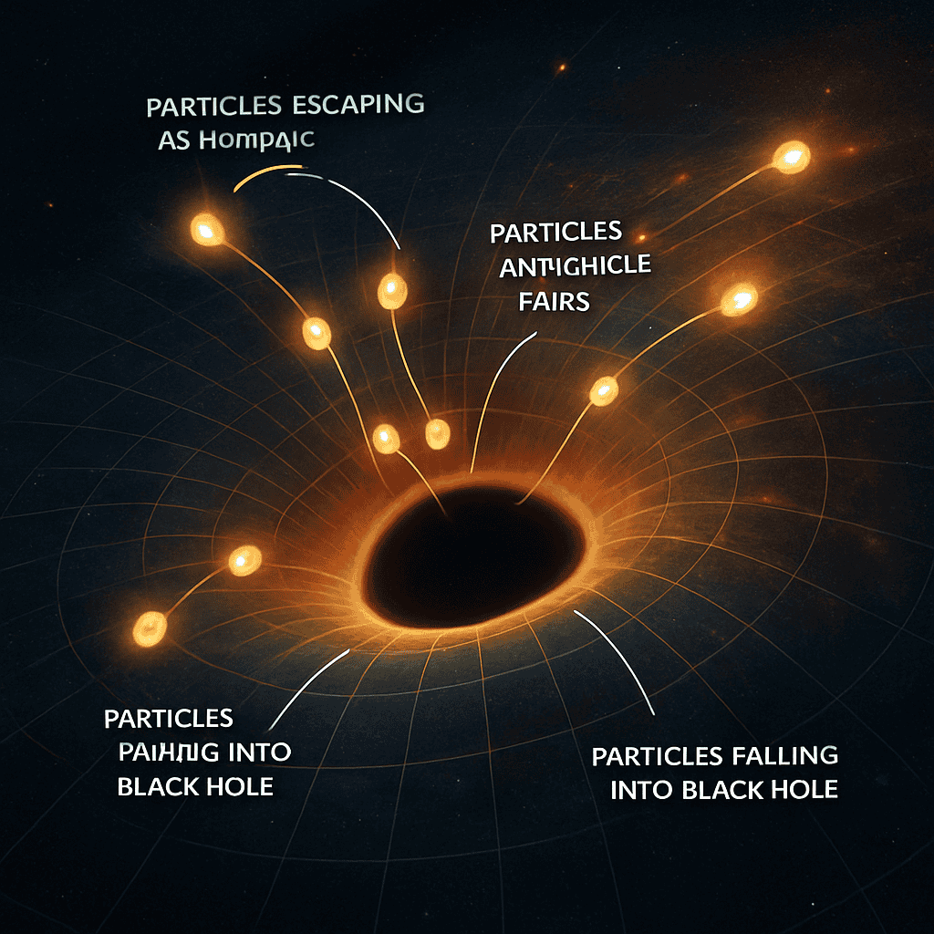 Near a black hole’s edge (the event horizon), tiny pairs of particles pop into existence: one is a particle, the other is its opposite, called an antiparticle.Sometimes, one particle falls into the black hole, while the other escapes into space.The escaping particle becomes real and can be detected, which makes it look like the black hole is giving off energy.Over a long time, this process slowly makes the black hole lose energy and shrink.So, black holes aren’t completely black—they can slowly “evaporate” by letting particles escape, thanks to this strange quantum effect called Hawking radiation!