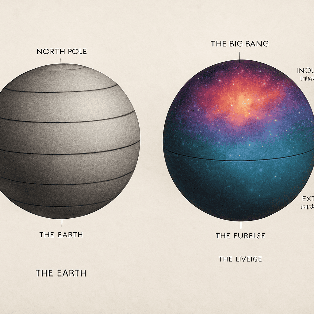 This idea compares the history of the universe to the surface of a sphere, kind of like Earth.Just as the North Pole is a starting point with no edge on Earth, the universe can begin (at the “Big Bang”) without a sharp boundary.As you move away from the North Pole, circles get larger — this is like time increasing and the universe getting bigger.Eventually, you reach a maximum size, then the circles shrink again, like the universe might contract in a “Big Crunch.”So, the universe doesn’t need a beginning or end with a sharp edge. It’s smooth and rounded in imaginary time, just like the surface of a sphere!