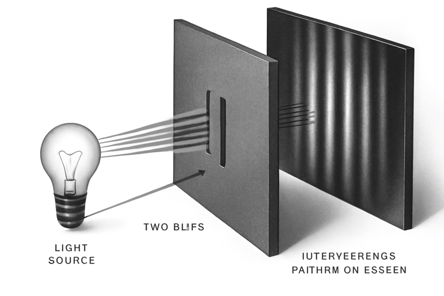 Imagine you’re in a super cool science lab! You shine a light at a wall, but this wall has two tiny openings—we call them slits.The light squeezes through both slits at once.•On the other side, a screen shows the results.•Here’s the magic part: Instead of just two bright lines on the screen, you see a bunch of stripes, like a zebra! That happens because the light acts like a wave, and the waves from each slit mix together, making patterns—just like ripples in a pond.It’s like throwing two stones into water and watching how the waves overlap and dance. This experiment shows that light can be tricky—sometimes behaving like wiggly waves, not just straight beams.Science is full of surprises, and sometimes, things are not what they seem… Just like in fun games or magic tricks!