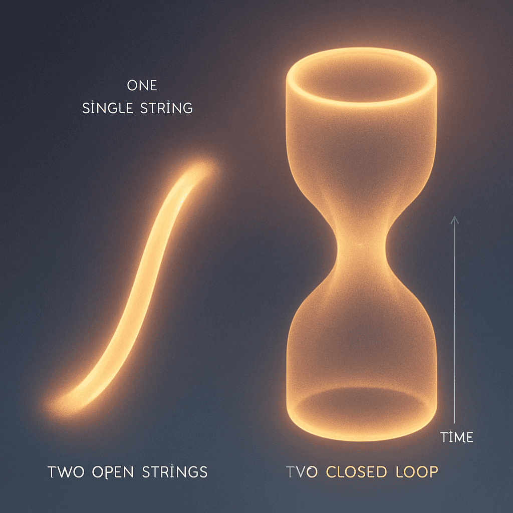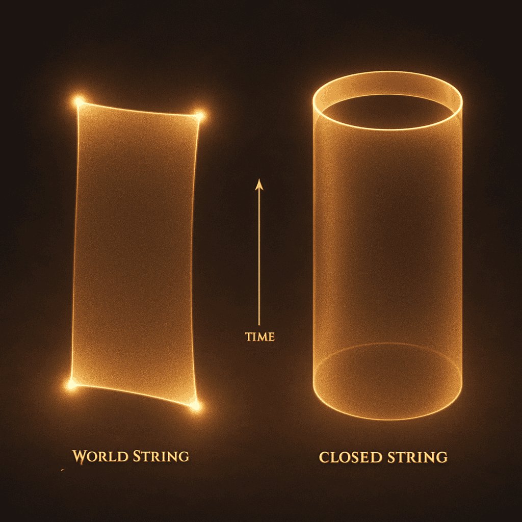 In string theory, tiny strings can be open (like a piece of spaghetti) or closed (like a loop). As time passes, an open string traces out a flat strip, while a closed string makes a tube shape.Open string: Ends move through space and time, drawing a strip (the worldsheet).Closed string: The loop moves, making a tube (the worldsheet).These shapes help scientists picture how strings travel and interact in the universe!