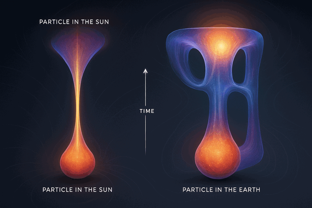 String theory says that forces like gravity are carried by tiny vibrating strings called gravitons.A particle in the sun and a particle on the earth can feel gravity because a graviton connects them, just like a wiggly string between two points.Scientists picture this connection as a worldsheet that can look like a straight line or even an H-shaped tube linking both particles.This theory helps describe how gravity works at the smallest scales and suggests everything is connected by strings—even huge distances across space!