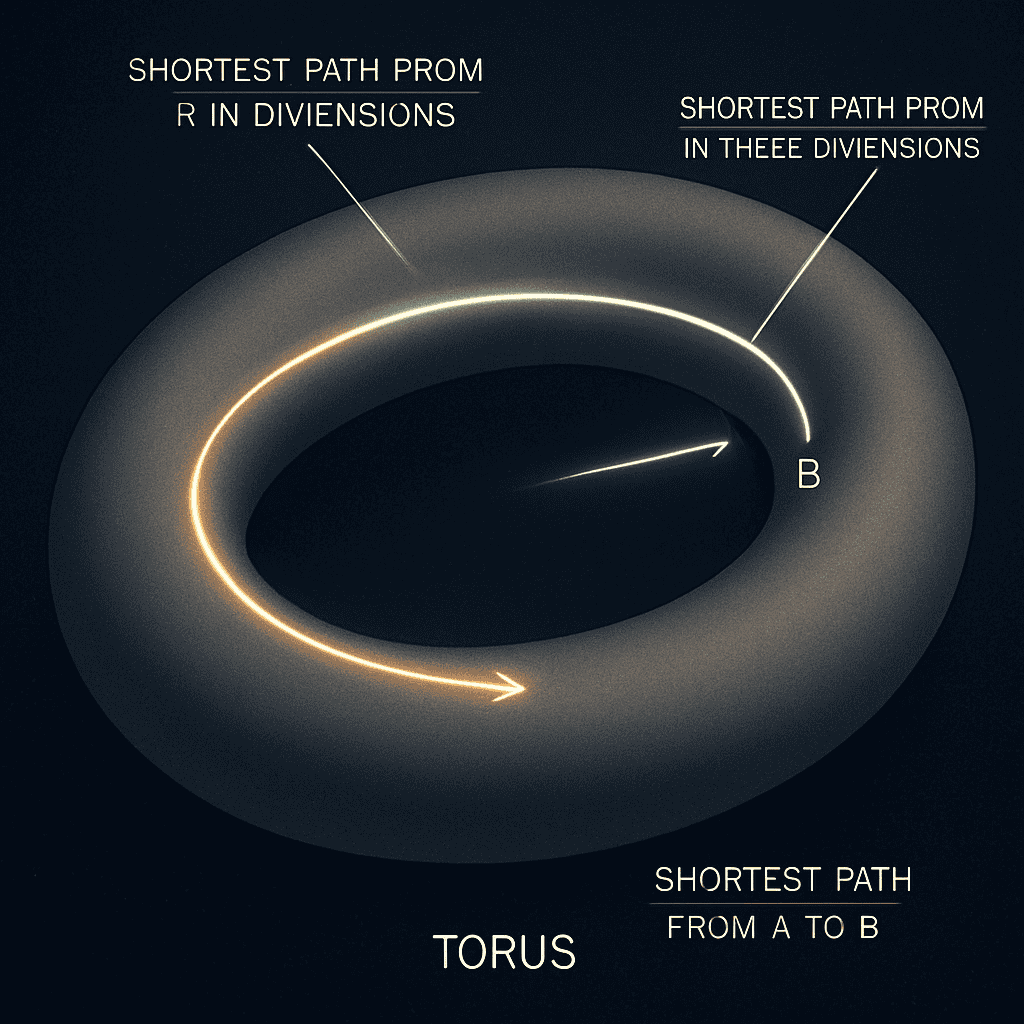 Imagine space as the curved surface of a donut (a torus). If you want to get from point A to B on the donut, you’d have to walk around the curve—this is the shortest path in two dimensions.But if you use a shortcut through a third dimension, you could go straight across! The idea here is that extra dimensions might exist but are curled up so tiny that we don’t notice them—just like a shortcut hidden inside the donut. That’s why we see only three big space dimensions in our everyday life!