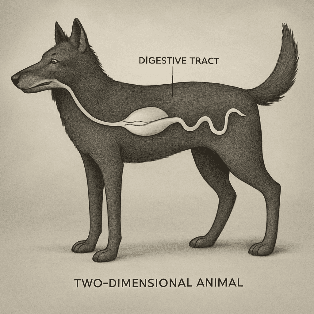 Imagine an animal that can only move in two directions—like up and down or left and right, but not in or out. Its body and even its digestive tract are completely flat, like a drawing on paper.This idea helps scientists picture what life would be like in a universe with only two dimensions. Everything would be squished and squeezed, which is very different from our three-dimensional world!